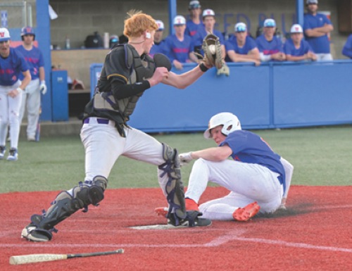 (5th inning) HV #11 gets his foot to home plate before Marshfield catcher #24 can drop his glove for a tag. SAFE! Scores HV's 5th run Hidden Valley wins over Marshfield, 10-2 Photos By: Joel Takarsh